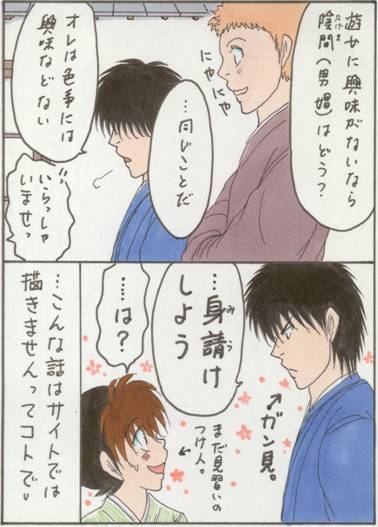 大店(おおだな)のぼんぼん・桜庭と、剣道場の嫡男・進は、身分は違うけど友達…で、もう十七なんだからと、大人の遊びをしようと誘う桜庭だけど、お固い進は全く興味を示さず。